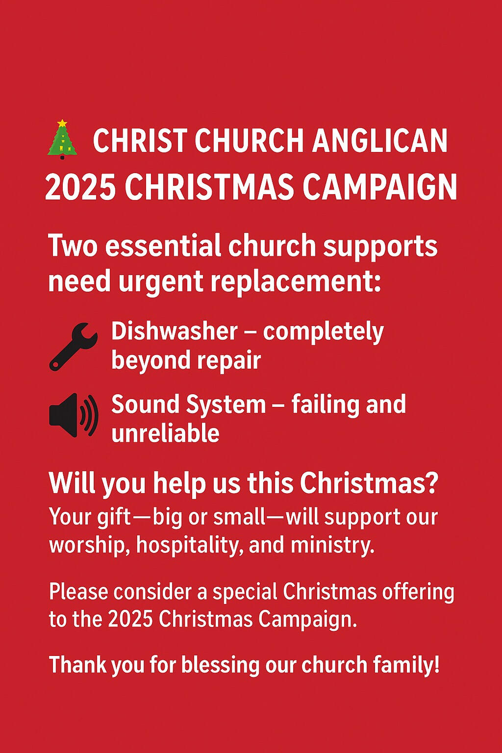 If you feel called to contribute, please consider making a special Christmas offering designated to the 2025 Christmas Campaign.You can donate via e-transfer to: [email protected]Or send a cheque payable to Christ Church Anglican: